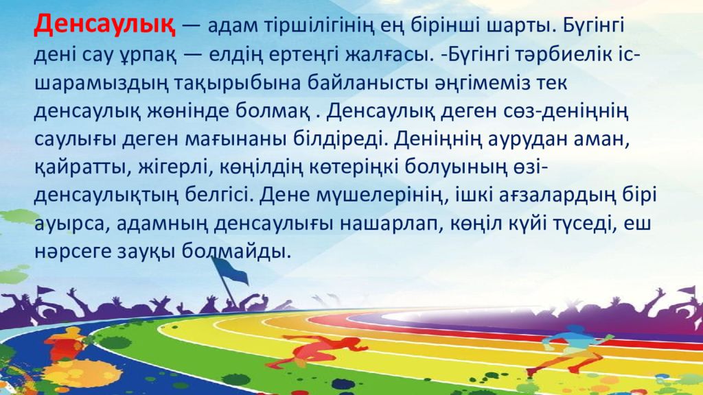 Денсаулық — адам тіршілігінің ең бірінші шарты. Бүгінгі дені сау ұрпақ — елдің ертеңгі жалғасы. - Бүгінгі тәрбиелік іс-шарамыздың тақырыбына байланысты әңгімеміз тек денсаулық жөнінде болмақ. Денсаулық деген сөз-деніңнің саулығы деген мағынаны білдіреді. Деніңнің аурудан аман, қайратты, жігерлі, көңілдің көтеріңкі болуының өзі-денсаулықтың белгісі. Дене мүшелерінің, ішкі ағзалардың бірі ауырса, адамның денсаулығы нашарлап, көңіл күйі түседі, еш нәрсеге зауқы болмайды.