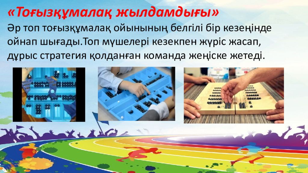 « Тоғызқұмалақ жылдамдығы » Әр топ тоғызқұмалақ ойынының белгілі бір кезеңінде ойнап шығады.Топ мүшелері кезекпен жүріс жасап, дұрыс стратегия қолданған команда жеңіске жетеді.