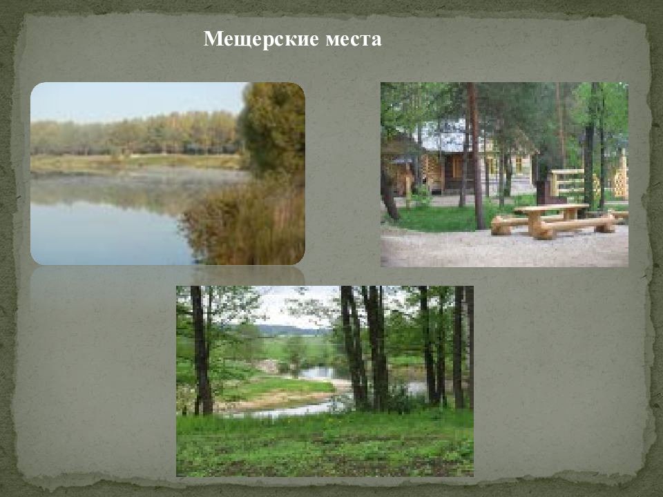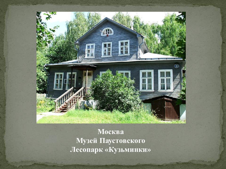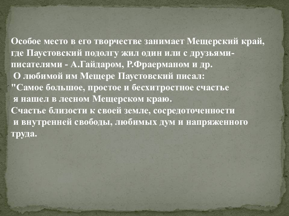 Особое место в его творчестве занимает Мещерский край, где Паустовский подолгу жил один или с друзьями-писателями - А.Гайдаром, Р.Фраерманом и др. О любимой им Мещере Паустовский писал: "Самое большое, простое и бесхитростное счастье я нашел в лесном Мещерском краю. Счастье близости к своей земле, сосредоточенности и внутренней свободы, любимых дум и напряженного труда.