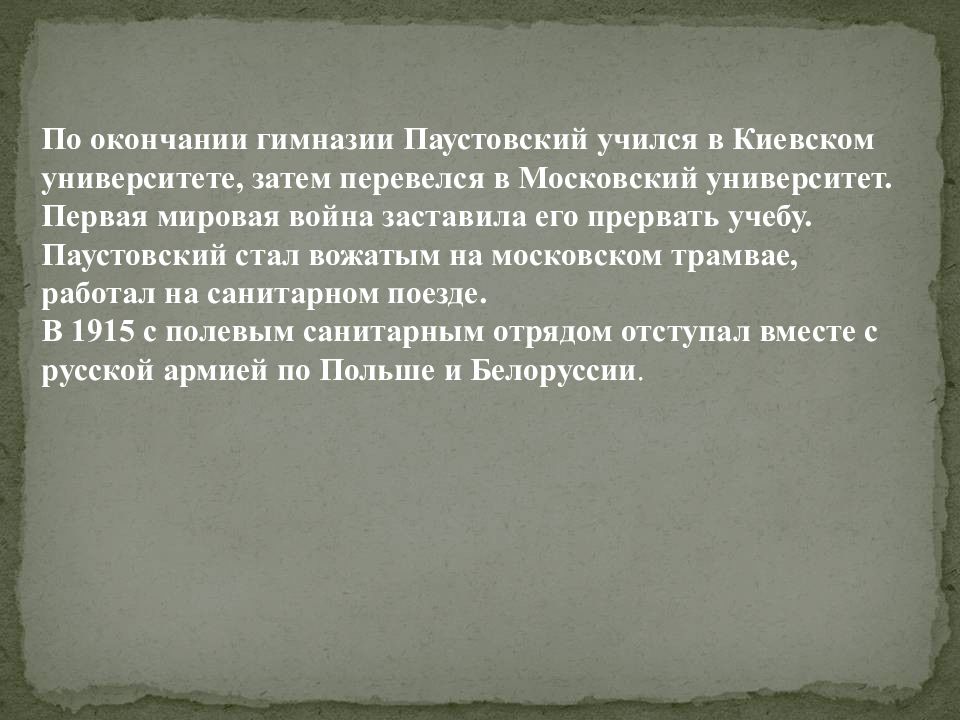 По окончании гимназии Паустовский учился в Киевском университете, затем перевелся в Московский университет. Первая мировая война заставила его прервать учебу. Паустовский стал вожатым на московском трамвае, работал на санитарном поезде. В 1915 с полевым санитарным отрядом отступал вместе с русской армией по Польше и Белоруссии.