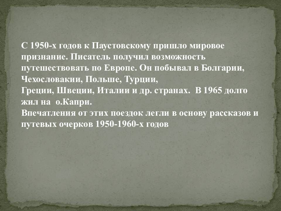 С 1950-х годов к Паустовскому пришло мировое признание. Писатель получил возможность путешествовать по Европе. Он побывал в Болгарии, Чехословакии, Польше, Турции, Греции, Швеции, Италии и др. странах. В 1965 долго жил на о.Капри. Впечатления от этих поездок легли в основу рассказов и путевых очерков 1950-1960-х годов