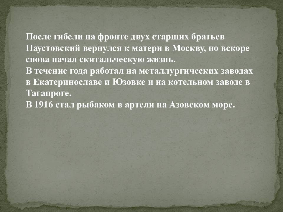 После гибели на фронте двух старших братьев Паустовский вернулся к матери в Москву, но вскоре снова начал скитальческую жизнь. В течение года работал на металлургических заводах в Екатеринославе и Юзовке и на котельном заводе в Таганроге. В 1916 стал рыбаком в артели на Азовском море.
