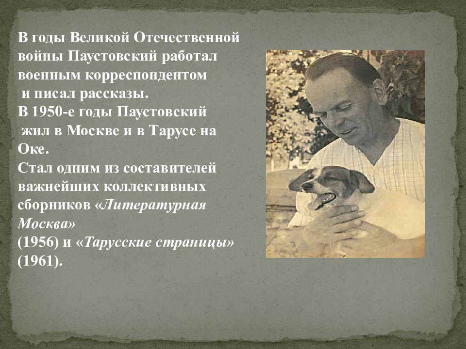 В годы Великой Отечественной войны Паустовский работал военным корреспондентом и писал рассказы. В 1950-е годы Паустовский жил в Москве и в Тарусе на Оке. Стал одним из составителей важнейших коллективных сборников « Литературная Москва» (1956) и « Тарусские страницы» (1961).