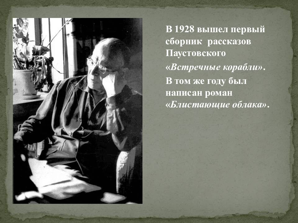 В 1928 вышел первый сборник рассказов Паустовского « Встречные корабли». В том же году был написан роман « Блистающие облака».
