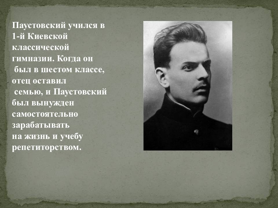 Паустовский учился в 1-й Киевской классической гимназии. Когда он был в шестом классе, отец оставил семью, и Паустовский был вынужден самостоятельно зарабатывать на жизнь и учебу репетиторством.