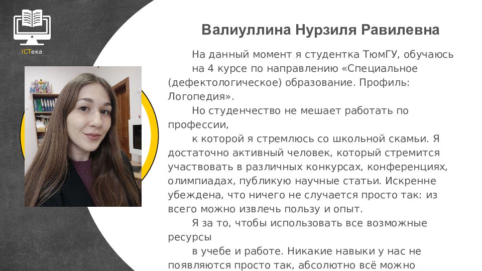 ICT ека Валиуллина Н урзиля Равилевна На данный момент я студентка ТюмГУ, обучаюсь на 4 курсе по направлению «Специальное (дефектологическое) образование. Профиль: Логопедия». Но студенчество не мешает работать по профессии, к которой я стремлюсь со школьной скамьи. Я достаточно активный человек, который стремится участвовать в различных конкурсах, конференциях, олимпиадах, публикую научные статьи. Искренне убеждена, что ничего не случается просто так: из всего можно извлечь пользу и опыт. Я за то, чтобы использовать все возможные ресурсы в учебе и работе. Никакие навыки у нас не появляются просто так, абсолютно всё можно использовать в необходимой нам деятельности. Мое кредо: «Человек делает себя сам».