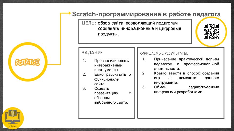 ICTека Scratch -программирование в работе педагога ЦЕЛЬ : ЗАДАЧИ : ОЖИДАЕМЫЕ РЕЗУЛЬТАТЫ: обзор сайта, позволяющий педагогам создавать инновационные и цифровые продукты. Проанализировать интерактивные инструменты. Емко рассказать о функционале сайта. Создать презентацию с обзором выбранного сайта. Принесение практической пользы педагогом в профессиональной деятельности. Кратко ввести в способ создания игр с помощью данного инструмента. Обмен педагогическими цифровыми разработками.