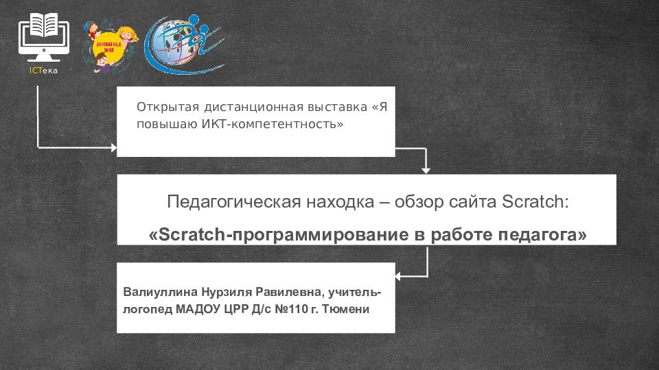 Педагогическая находка – обзор сайта Scratch : « Scratch -программирование в работе педагога» ICT ека Валиуллина Нурзиля Равилевна, учитель-логопед МАДОУ ЦРР Д/с №110 г. Тюмени Открытая дистанционная выставка «Я повышаю ИКТ-компетентность»