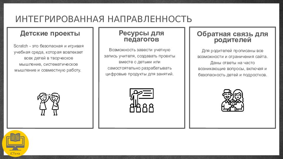 Scratch - это безопасная и игривая учебная среда, которая вовлекает всех детей в творческое мышление, систематическое мышление и совместную работу. ICTека Детские проекты ИНТЕГРИРОВАННАЯ НАПРАВЛЕННОСТЬ Ресурсы для педагогов Возможность завести учетную запись учителя, создавать проекты вместе с детьми или самостоятельно разрабатывать цифровые продукты для занятий. Обратная связь для родителей Для родителей прописаны все возможности и ограничения сайта. Даны ответы на часто возникающие вопросы, включая и безопасность детей и подростков.