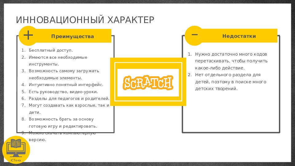 Бесплатный доступ. Имеются все необходимые инструменты. Возможность самому загружать необходимые элементы. Интуитивно понятный интерфейс. Есть руководство, видео-уроки. Разделы для педагогов и родителей. Могут создавать как взрослые, так и дети. Возможность брать за основу готовую игру и редактировать. Можно скачать компьютерную версию. Преимущества ICTека ИННОВАЦИОННЫЙ ХАРАКТЕР + Недостатки – Нужно достаточно много кодов перетаскивать, чтобы получить какое-либо действие. Нет отдельного раздела для детей, поэтому в поиске много детских творений.