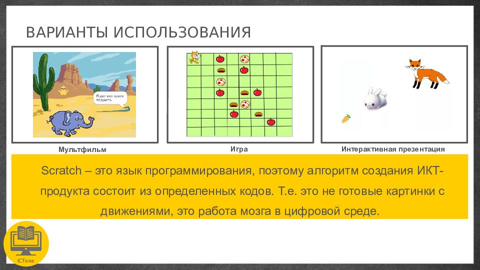 ICTека ВАРИАНТЫ ИСПОЛЬЗОВАНИЯ Scratch – это язык программирования, поэтому алгоритм создания ИКТ-продукта состоит из определенных кодов. Т.е. это не готовые картинки с движениями, это работа мозга в цифровой среде. Мультфильм Игра Интерактивная презентация