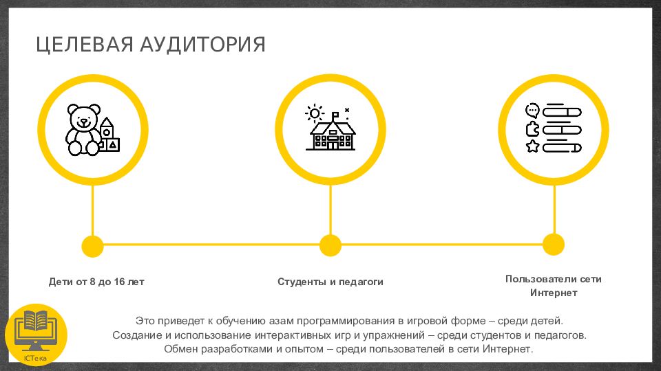ICTека ЦЕЛЕВАЯ АУДИТОРИЯ Дети от 8 до 16 лет Это приведет к обучению азам программирования в игровой форме – среди детей. Создание и использование интерактивных игр и упражнений – среди студентов и педагогов. Обмен разработками и опытом – среди пользователей в сети Интернет. Студенты и педагоги Пользователи сети Интернет