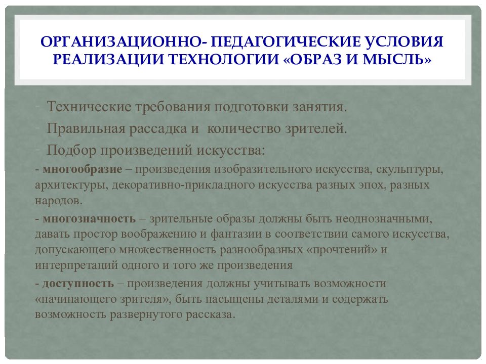 Технические требования подготовки занятия. Правильная рассадка и количество зрителей. Подбор произведений искусства: - многообразие – произведения изобразительного искусства, скульптуры, архитектуры, декоративно-прикладного искусства разных эпох, разных народов. - многозначность – зрительные образы должны быть неоднозначными, давать простор воображению и фантазии в соответствии самого искусства, допускающего множественность разнообразных «прочтений» и интерпретаций одного и того же произведения - доступность – произведения должны учитывать возможности «начинающего зрителя», быть насыщены деталями и содержать возможность развернутого рассказа.