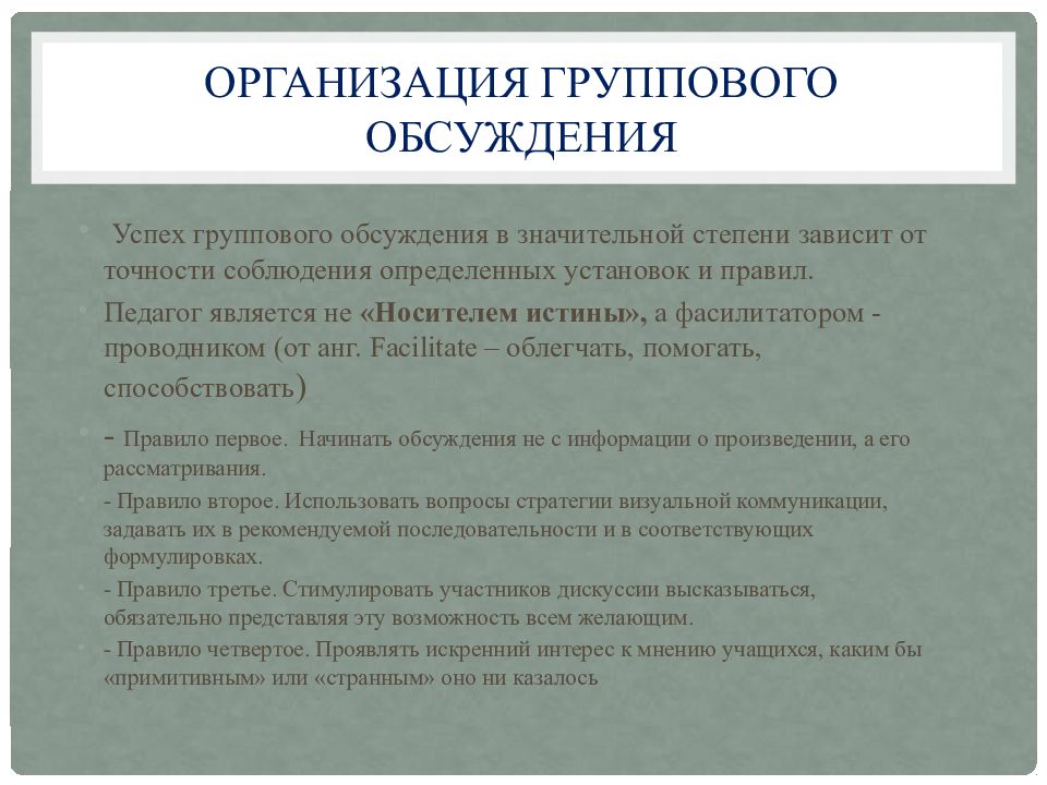 Успех группового обсуждения в значительной степени зависит от точности соблюдения определенных установок и правил. Педагог является не «Носителем истины», а фасилитатором - проводником (от анг. Facilitate – облегчать, помогать, способствовать ) - Правило первое. Начинать обсуждения не с информации о произведении, а его рассматривания. - Правило второе. Использовать вопросы стратегии визуальной коммуникации, задавать их в рекомендуемой последовательности и в соответствующих формулировках. - Правило третье. Стимулировать участников дискуссии высказываться, обязательно представляя эту возможность всем желающим. - Правило четвертое. Проявлять искренний интерес к мнению учащихся, каким бы «примитивным» или «странным» оно ни казалось