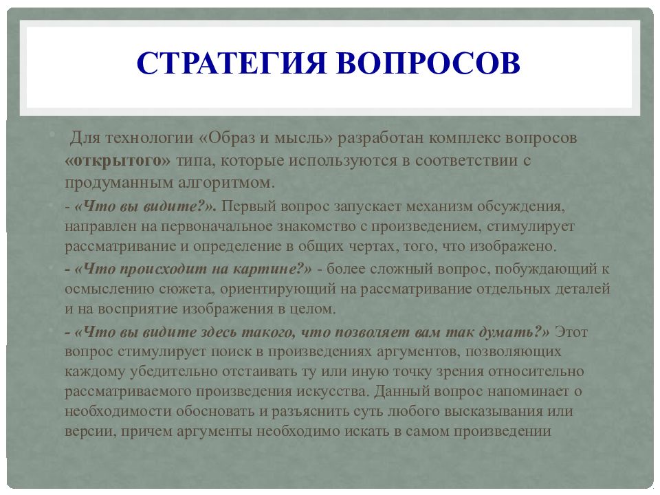 Для технологии «Образ и мысль» разработан комплекс вопросов «открытого» типа, которые используются в соответствии с продуманным алгоритмом. - «Что вы видите?». Первый вопрос запускает механизм обсуждения, направлен на первоначальное знакомство с произведением, стимулирует рассматривание и определение в общих чертах, того, что изображено. - «Что происходит на картине?» - более сложный вопрос, побуждающий к осмыслению сюжета, ориентирующий на рассматривание отдельных деталей и на восприятие изображения в целом. - «Что вы видите здесь такого, что позволяет вам так думать?» Этот вопрос стимулирует поиск в произведениях аргументов, позволяющих каждому убедительно отстаивать ту или иную точку зрения относительно рассматриваемого произведения искусства. Данный вопрос напоминает о необходимости обосновать и разъяснить суть любого высказывания или версии, причем аргументы необходимо искать в самом произведении