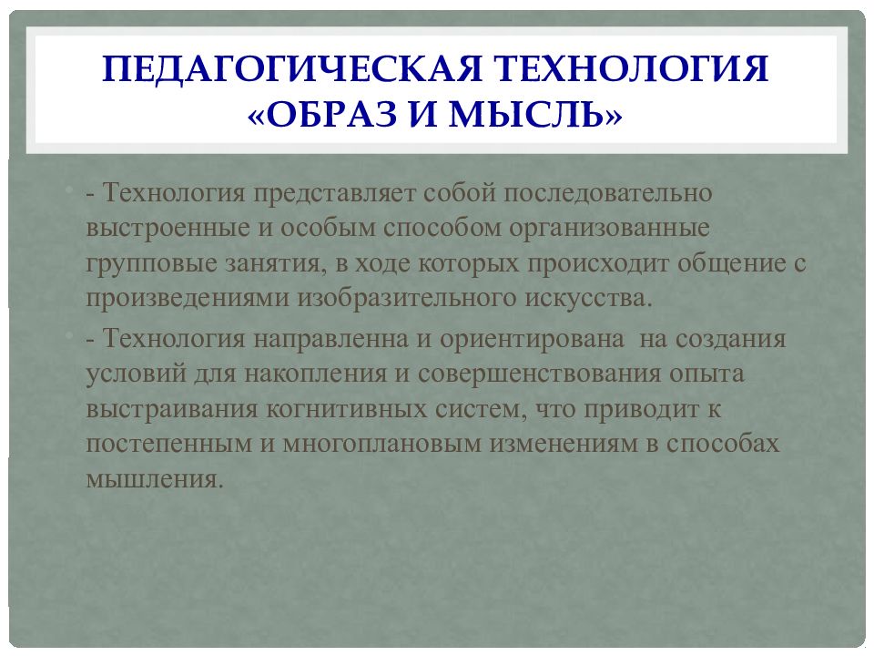 - Технология представляет собой последовательно выстроенные и особым способом организованные групповые занятия, в ходе которых происходит общение с произведениями изобразительного искусства. - Технология направленна и ориентирована на создания условий для накопления и совершенствования опыта выстраивания когнитивных систем, что приводит к постепенным и многоплановым изменениям в способах мышления.