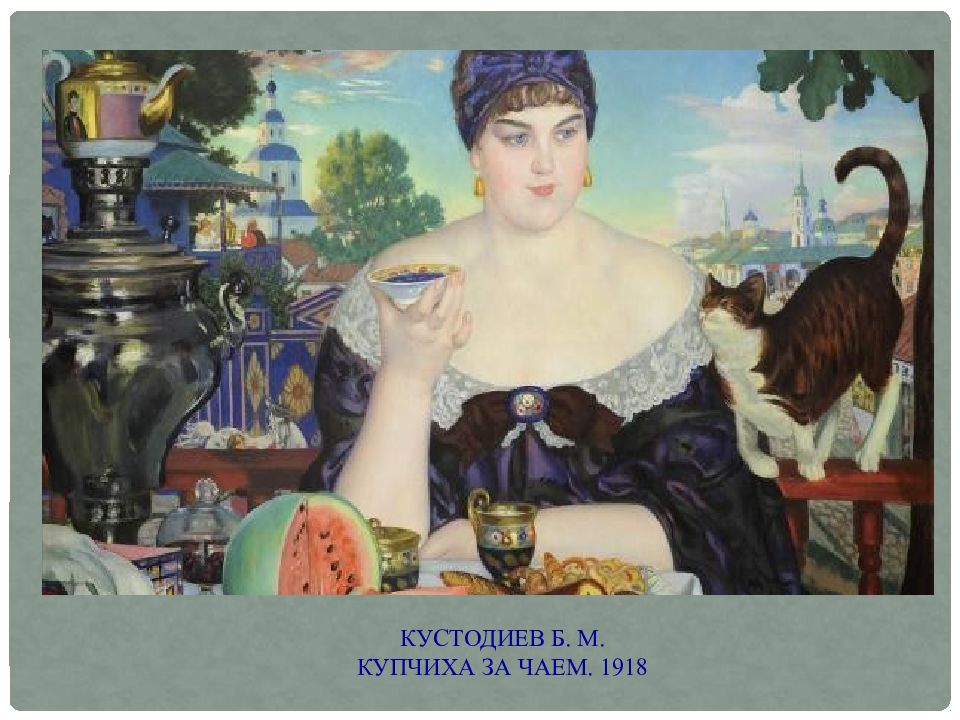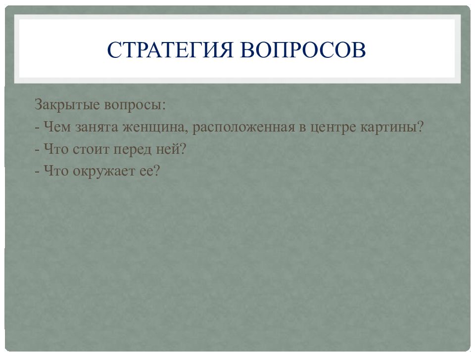 Закрытые вопросы: - Чем занята женщина, расположенная в центре картины? - Что стоит перед ней? - Что окружает ее?