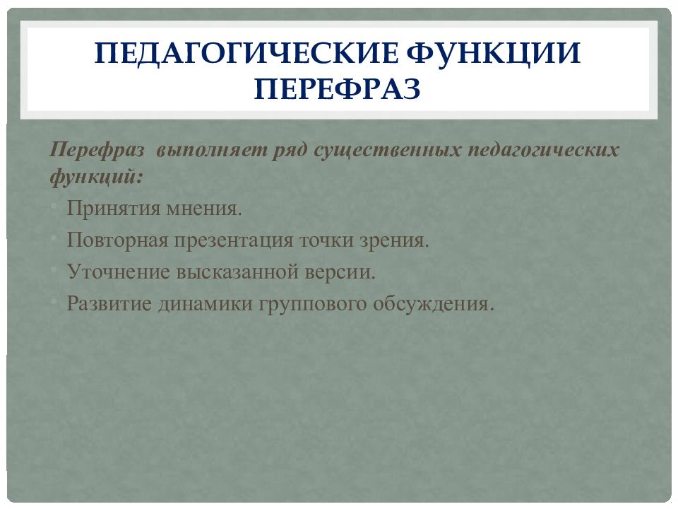 Перефраз выполняет ряд существенных педагогических функций: Принятия мнения. Повторная презентация точки зрения. Уточнение высказанной версии. Развитие динамики группового обсуждения.