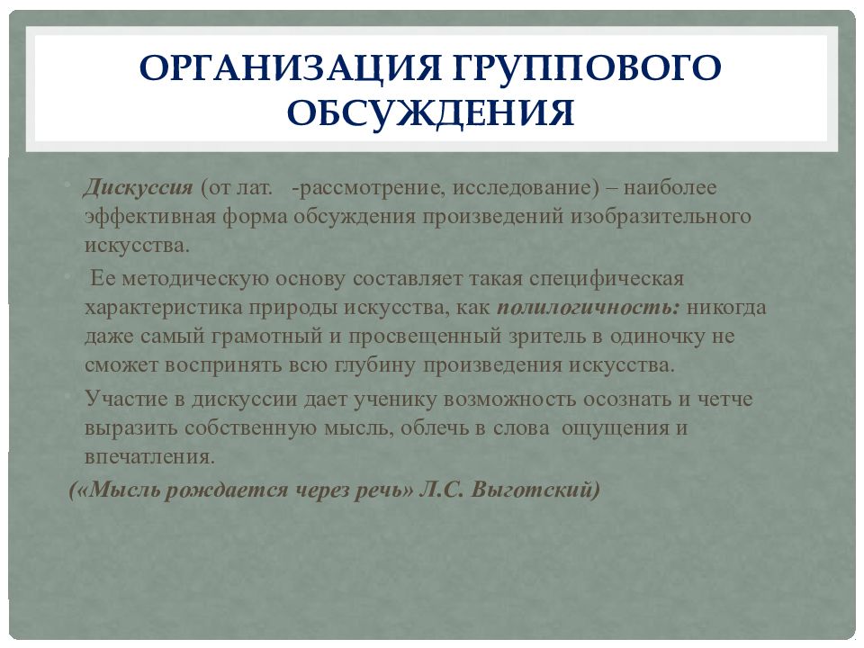 Дискуссия (от лат. -рассмотрение, исследование) – наиболее эффективная форма обсуждения произведений изобразительного искусства. Ее методическую основу составляет такая специфическая характеристика природы искусства, как полилогичность : никогда даже самый грамотный и просвещенный зритель в одиночку не сможет воспринять всю глубину произведения искусства. Участие в дискуссии дает ученику возможность осознать и четче выразить собственную мысль, облечь в слова ощущения и впечатления. («Мысль рождается через речь» Л.С. Выготский)