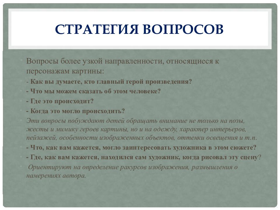 Вопросы более узкой направленности, относящиеся к персонажам картины: - Как вы думаете, кто главный герой произведения? - Что мы можем сказать об этом человеке? - Где это происходит? - Когда это могло происходить? Эти вопросы побуждают детей обращать внимание не только на позы, жесты и мимику героев картины, но и на одежду, характер интерьеров, пейзажей, особенности изображенных объектов, оттенки освещения и т.п. - Что, как вам кажется, могло заинтересовать художника в этом сюжете? - Где, как вам кажется, находился сам художник, когда рисовал эту сцену ? Ориентируют на определение ракурсов изображения, размышления о намерениях автора.