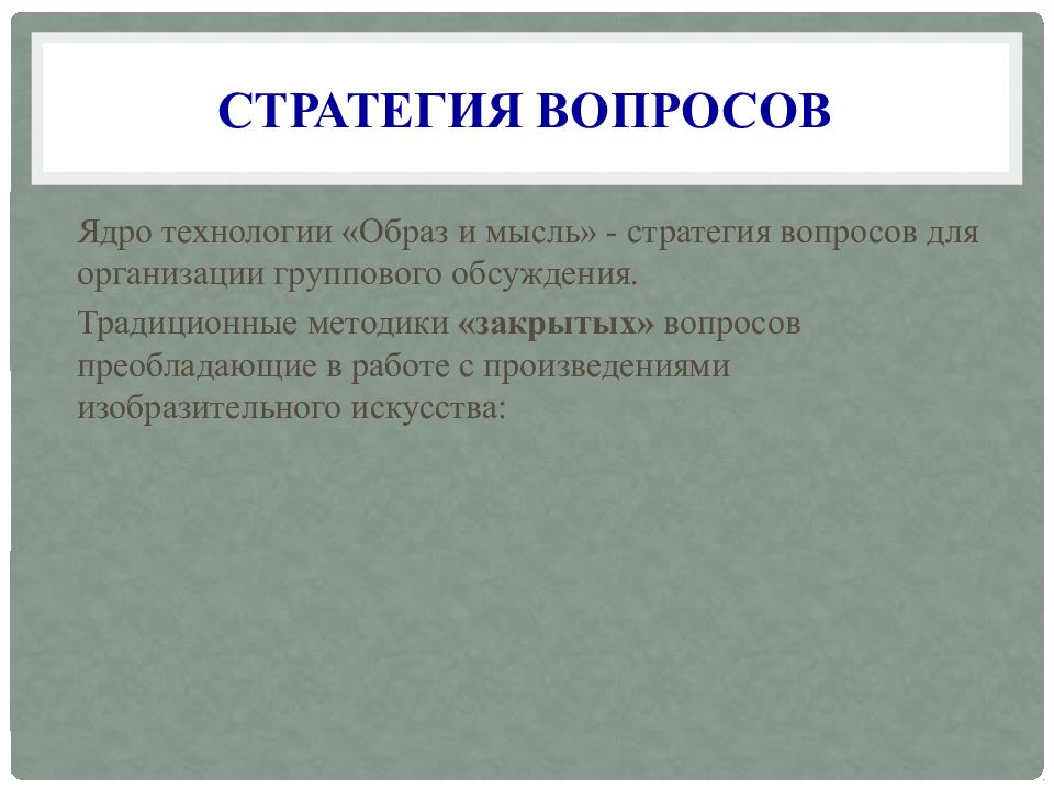 Ядро технологии «Образ и мысль» - стратегия вопросов для организации группового обсуждения. Традиционные методики «закрытых» вопросов преобладающие в работе с произведениями изобразительного искусства: