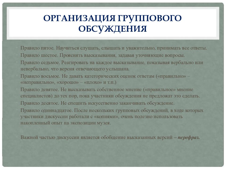 Правило пятое. Научиться слушать, слышать и уважительно, принимать все ответы. Правило шестое. Прояснять высказывания, задавая уточняющие вопросы. Правило седьмое. Реагировать на каждое высказывание, показывая вербально или невербально, что версия отвечающего услышана. Правило восьмое. Не давать категорических оценок ответам («правильно» – «неправильно», «хорошо» – «плохо» и т.п.) Правило девятое. Не высказывать собственное мнение («правильное» мнение специалистов) до тех пор, пока участники обсуждения не предложат это сделать. Правило десятое. Не спешить искусственно заканчивать обсуждение. Правило одиннадцатое. После нескольких групповых обсуждений, в ходе которых участники дискуссии работали с «копиями», очень полезно использовать накопленный опыт на экспозиции музея. Важной частью дискуссии является обобщение высказанных версий – перефраз.