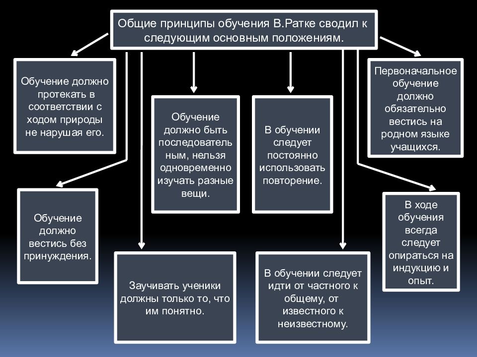 Общие принципы обучения В.Ратке сводил к следующим основным положениям. Обучение должно протекать в соответствии с ходом природы не нарушая его. В обучении следует постоянно использовать повторение. Первоначальное обучение должно обязательно вестись на родном языке учащихся. В ходе обучения всегда следует опираться на индукцию и опыт. В обучении следует идти от частного к общему, от известного к неизвестному. Заучивать ученики должны только то, что им понятно. Обучение должно быть последовательным, нельзя одновременно изучать разные вещи. Обучение должно вестись без принуждения.