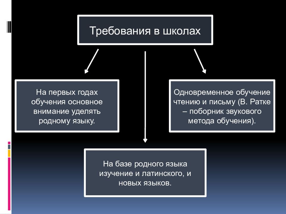 Требования в школах На первых годах обучения основное внимание уделять родному языку. На базе родного языка изучение и латинского, и новых языков. Одновременное обучение чтению и письму (В. Ратке – поборник звукового метода обучения).