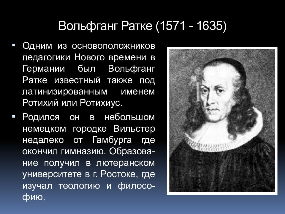 Одним из основоположников педагогики Нового времени в Германии был Вольфганг Ратке известный также под латинизированным именем Ротихий или Ротихиус. Родился он в небольшом немецком городке Вильстер недалеко от Гамбурга где окончил гимназию. Образова-ние получил в лютеранском университете в г. Ростоке, где изучал теологию и филосо-фию.