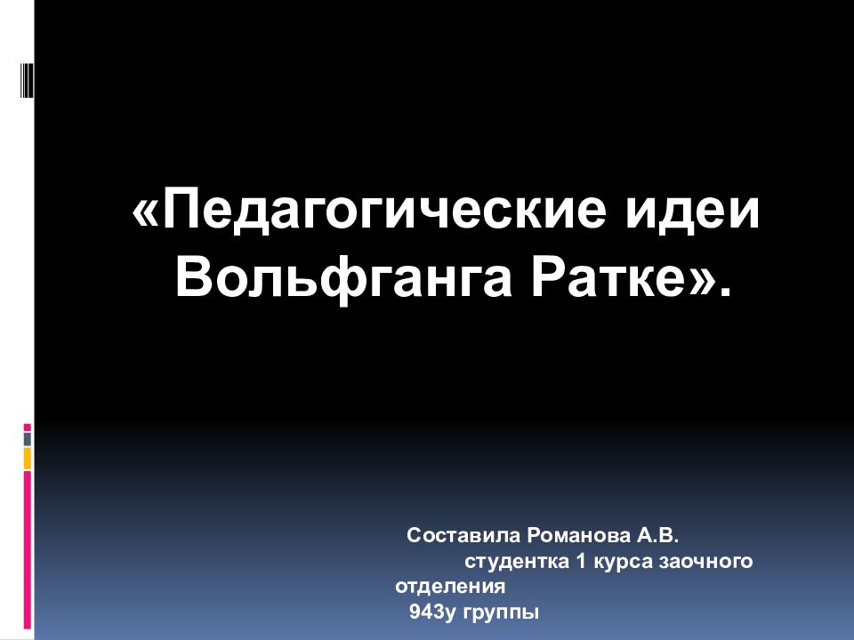 «Педагогические идеи Вольфганга Ратке». Составила Романова А.В. студентка 1 курса заочного отделения 943у группы