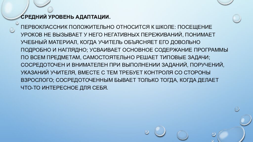 Средний уровень адаптации. Первоклассник положительно относится к школе: посещение уроков не вызывает у него негативных переживаний, понимает учебный материал, когда учитель объясняет его довольно подробно и наглядно; усваивает основное содержание программы по всем предметам, самостоятельно решает типовые задачи; сосредоточен и внимателен при выполнении заданий, поручений, указаний учителя, вместе с тем требует контроля со стороны взрослого; сосредоточенным бывает только тогда, когда делает что-то интересное для себя.