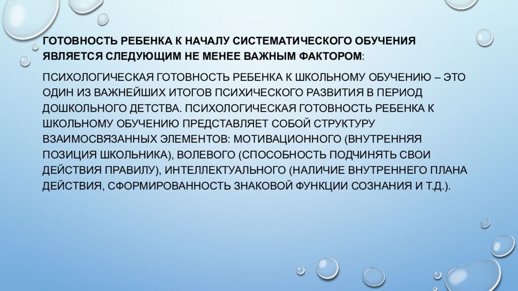Готовность ребенка к началу систематического обучения является следующим не менее важным фактором : Психологическая готовность ребенка к школьному обучению – это один из важнейших итогов психического развития в период дошкольного детства. психологическая готовность ребенка к школьному обучению представляет собой структуру взаимосвязанных элементов: мотивационного (внутренняя позиция школьника), волевого (способность подчинять свои действия правилу), интеллектуального (наличие внутреннего плана действия, сформированность знаковой функции сознания и т.д.).