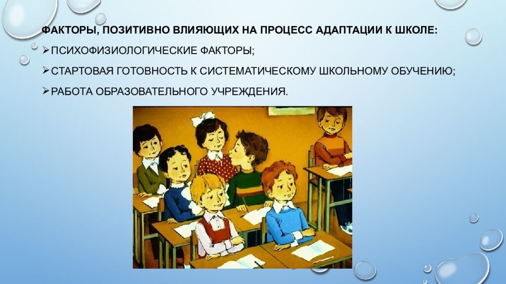 Ф акторы, позитивно влияющих на процесс адаптации к школе: психофизиологические факторы ; стартовая готовность к систематическому школьному обучению; работа образовательного учреждения.