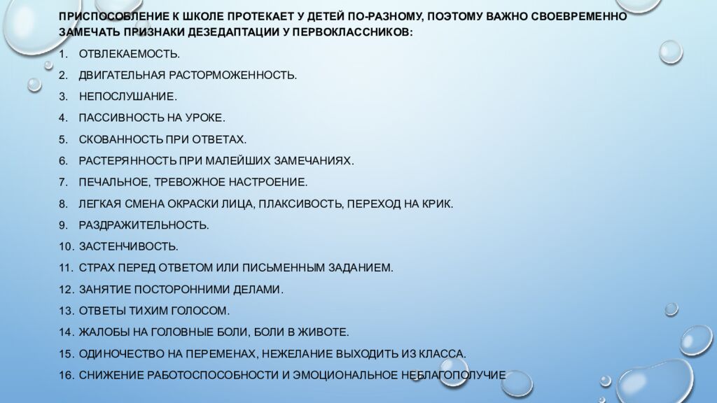 Приспособление к школе протекает у детей по-разному, поэтому важно своевременно замечать признаки дезедаптации у первоклассников: 1. Отвлекаемость. 2. Двигательная расторможенность. 3. Непослушание. 4. Пассивность на уроке. 5. Скованность при ответах. 6. Растерянность при малейших замечаниях. 7. Печальное, тревожное настроение. 8. Легкая смена окраски лица, плаксивость, переход на крик. 9. Раздражительность. 10. Застенчивость. 11. Страх перед ответом или письменным заданием. 12. Занятие посторонними делами. 13. Ответы тихим голосом. 14. Жалобы на головные боли, боли в животе. 15. Одиночество на переменах, нежелание выходить из класса. 16. Снижение работоспособности и эмоциональное неблагополучие