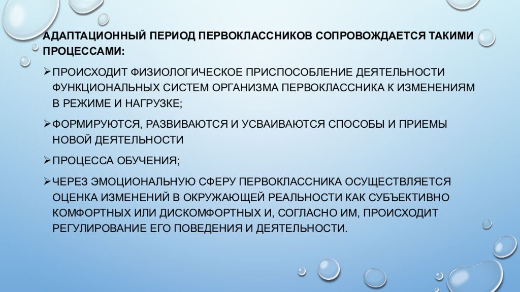 Адаптационный период первоклассников сопровождается такими процессами: происходит физиологическое приспособление деятельности функциональных систем организма первоклассника к изменениям в режиме и нагрузке; формируются, развиваются и усваиваются способы и приемы новой деятельности процесса обучения; через эмоциональную сферу первоклассника осуществляется оценка изменений в окружающей реальности как субъективно комфортных или дискомфортных и, согласно им, происходит регулирование его поведения и деятельности.