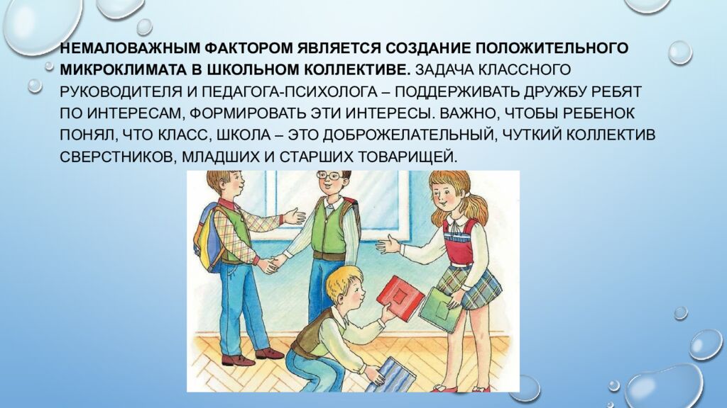 Немаловажным фактором является создание положительного микроклимата в школьном коллективе. Задача классного руководителя и педагога-психолога – поддерживать дружбу ребят по интересам, формировать эти интересы. Важно, чтобы ребенок понял, что класс, школа – это доброжелательный, чуткий коллектив сверстников, младших и старших товарищей.