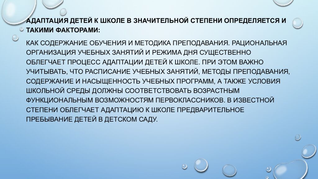 Адаптация детей к школе в значительной степени определяется и такими факторами : как содержание обучения и методика преподавания. Рациональная организация учебных занятий и режима дня существенно облегчает процесс адаптации детей к школе. При этом важно учитывать, что расписание учебных занятий, методы преподавания, содержание и насыщенность учебных программ, а также условия школьной среды должны соответствовать возрастным функциональным возможностям первоклассников. В известной степени облегчает адаптацию к школе предварительное пребывание детей в детском саду.