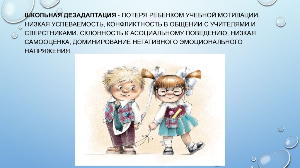 Школьная дезадаптация - потеря ребенком учебной мотивации, низкая успеваемость, конфликтность в общении с учителями и сверстниками. Склонность к асоциальному поведению, низкая самооценка, доминирование негативного эмоционального напряжения.
