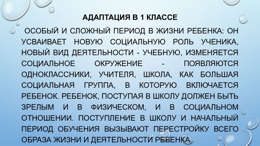 Адаптация в 1 классе особый и сложный период в жизни ребенка: он усваивает новую социальную роль ученика, новый вид деятельности - учебную, изменяется социальное окружение - появляются одноклассники, учителя, школа, как большая социальная группа, в которую включается ребенок. Ребенок, поступая в школу должен быть зрелым и в физическом, и в социальном отношении. Поступление в школу и начальный период обучения вызывают перестройку всего образа жизни и деятельности ребенка.