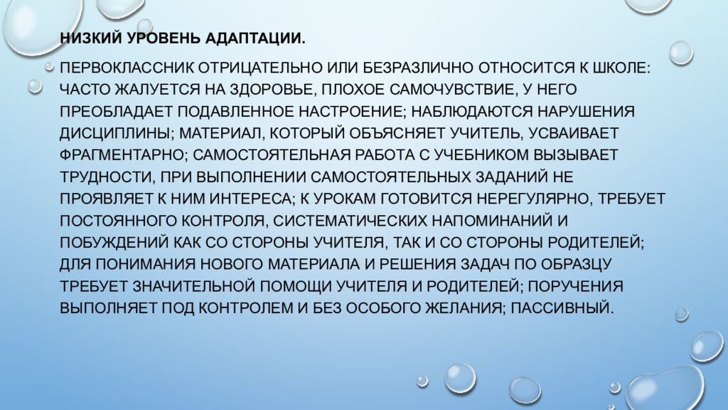 Низкий уровень адаптации. Первоклассник отрицательно или безразлично относится к школе: часто жалуется на здоровье, плохое самочувствие, у него преобладает подавленное настроение; наблюдаются нарушения дисциплины; материал, который объясняет учитель, усваивает фрагментарно; самостоятельная работа с учебником вызывает трудности, при выполнении самостоятельных заданий не проявляет к ним интереса; к урокам готовится нерегулярно, требует постоянного контроля, систематических напоминаний и побуждений как со стороны учителя, так и со стороны родителей; для понимания нового материала и решения задач по образцу требует значительной помощи учителя и родителей; поручения выполняет под контролем и без особого желания; пассивный.