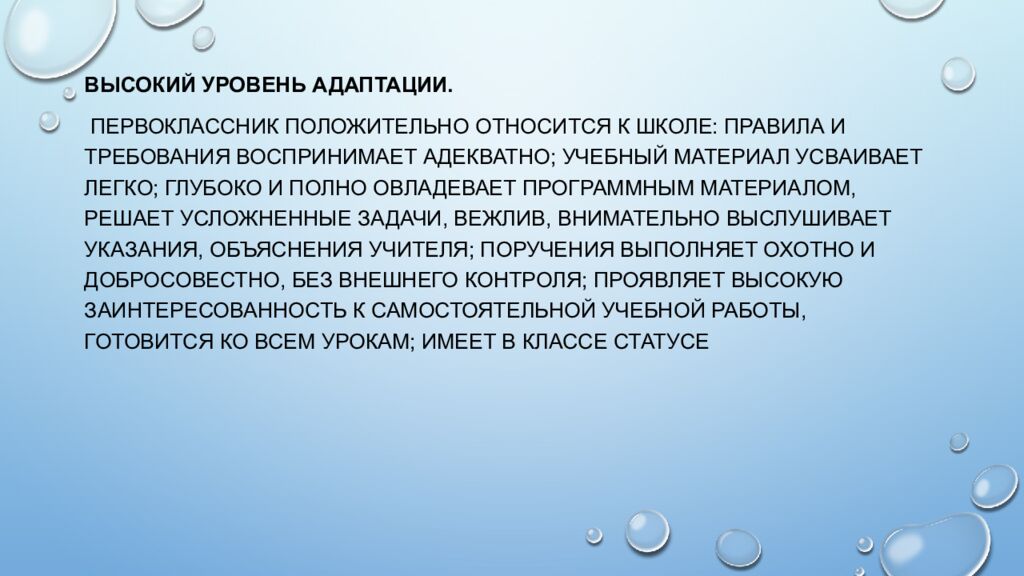 Высокий уровень адаптации. Первоклассник положительно относится к школе: правила и требования воспринимает адекватно; учебный материал усваивает легко; глубоко и полно овладевает программным материалом, решает усложненные задачи, вежлив, внимательно выслушивает указания, объяснения учителя; поручения выполняет охотно и добросовестно, без внешнего контроля; проявляет высокую заинтересованность к самостоятельной учебной работы, готовится ко всем урокам; имеет в классе статусе