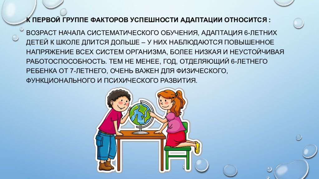 К первой группе факторов успешности адаптации относится : возраст начала систематического обучения, Адаптация 6-летних детей к школе длится дольше – у них наблюдаются повышенное напряжение всех систем организма, более низкая и неустойчивая работоспособность. Тем не менее, год, отделяющий 6-летнего ребенка от 7-летнего, очень важен для физического, функционального и психического развития.