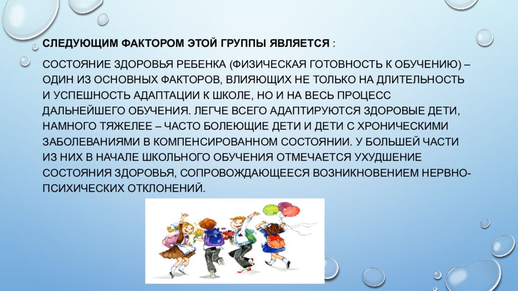 Следующим фактором этой группы является : состояние здоровья ребенка (физическая готовность к обучению) – один из основных факторов, влияющих не только на длительность и успешность адаптации к школе, но и на весь процесс дальнейшего обучения. Легче всего адаптируются здоровые дети, намного тяжелее – часто болеющие дети и дети с хроническими заболеваниями в компенсированном состоянии. У большей части из них в начале школьного обучения отмечается ухудшение состояния здоровья, сопровождающееся возникновением нервно-психических отклонений.