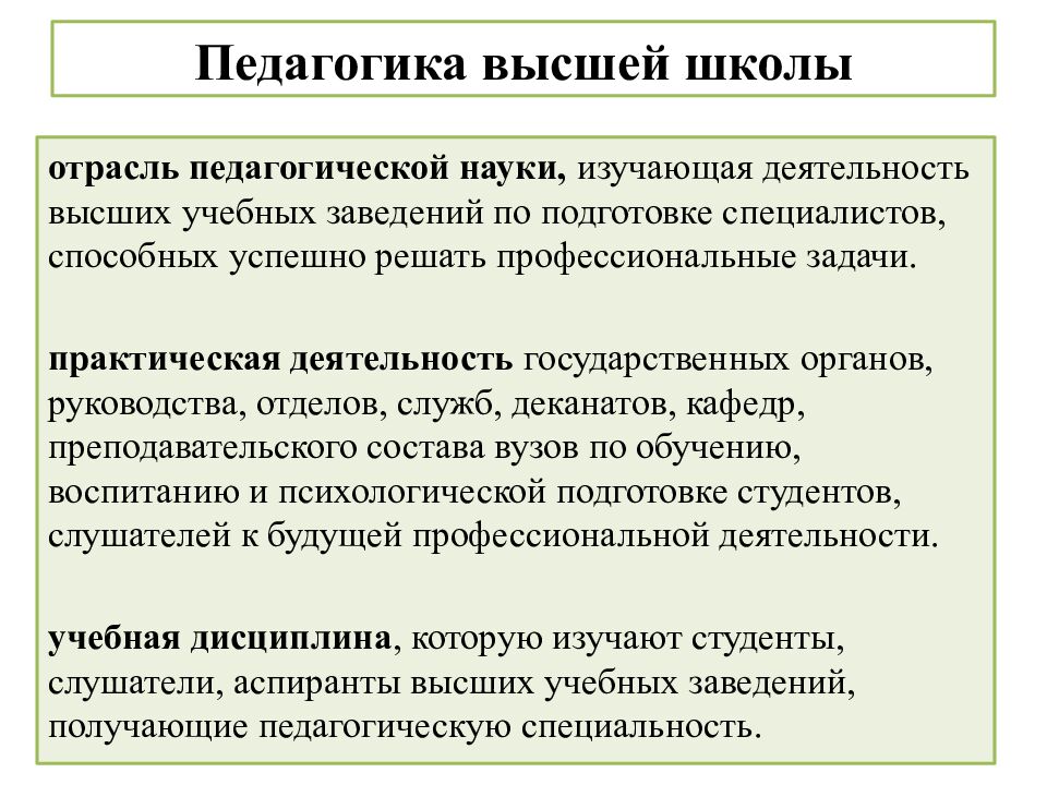 отрасль педагогической науки, изучающая деятельность высших учебных заведений по подготовке специалистов, способных успешно решать профессиональные задачи. практическая деятельность государственных органов, руководства, отделов, служб, деканатов, кафедр, преподавательского состава вузов по обучению, воспитанию и психологической подготовке студентов, слушателей к будущей профессиональной деятельности. учебная дисциплина, которую изучают студенты, слушатели, аспиранты высших учебных заведений, получающие педагогическую специальность.
