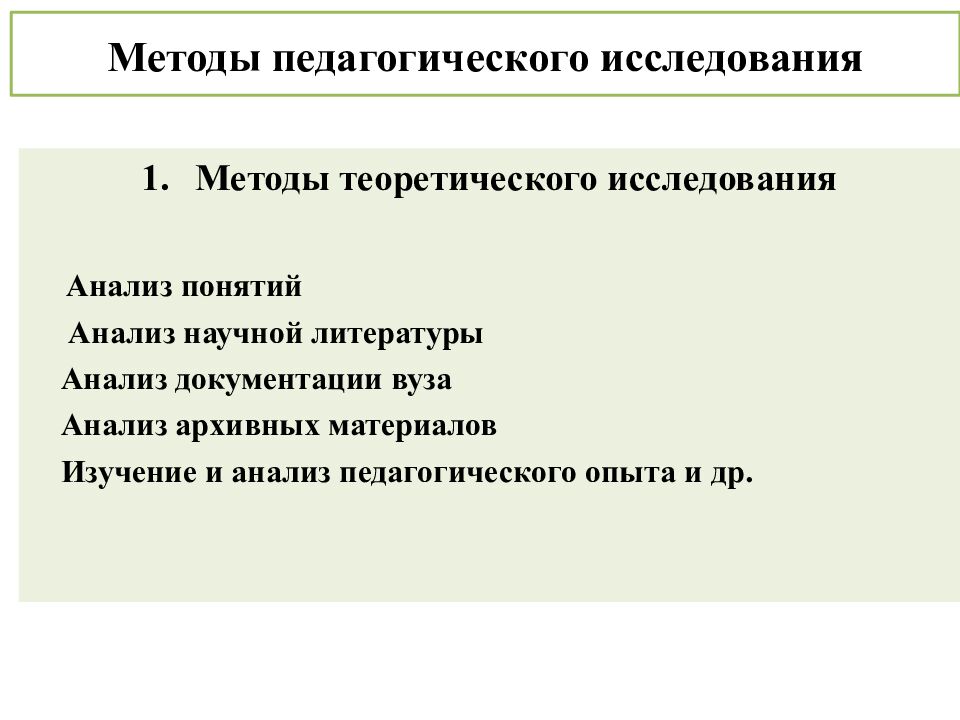 Методы теоретического исследования Анализ понятий Анализ научной литературы Анализ документации вуза Анализ архивных материалов Изучение и анализ педагогического опыта и др.