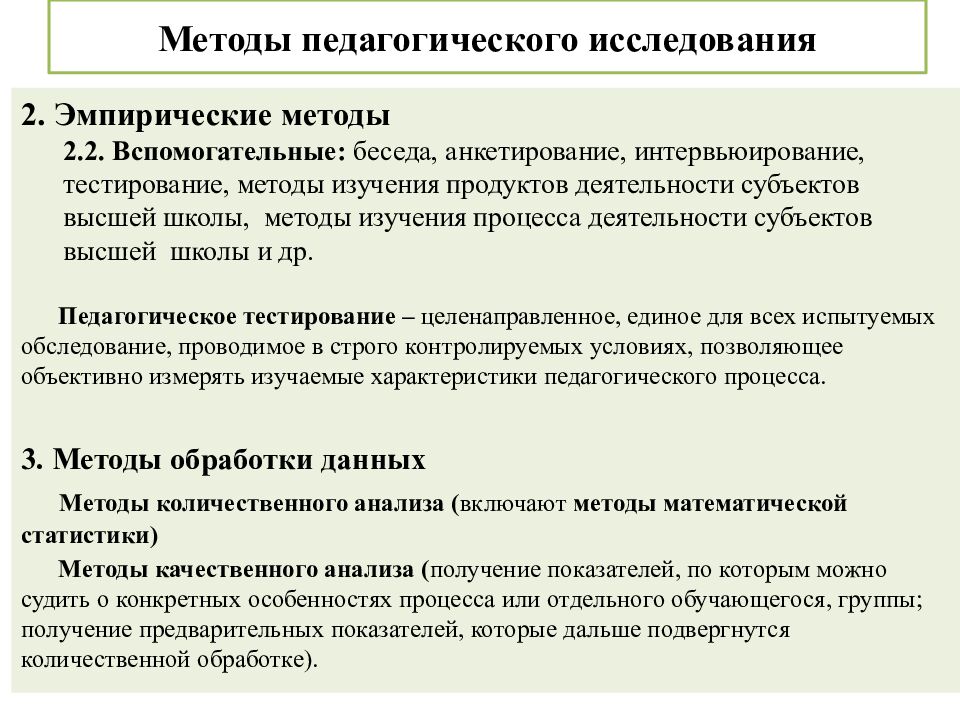 2. Эмпирические методы 2.2. Вспомогательные: беседа, анкетирование, интервьюирование, тестирование, методы изучения продуктов деятельности субъектов высшей школы, методы изучения процесса деятельности субъектов высшей школы и др. Педагогическое тестирование – целенаправленное, единое для всех испытуемых обследование, проводимое в строго контролируемых условиях, позволяющее объективно измерять изучаемые характеристики педагогического процесса. 3. Методы обработки данных Методы количественного анализа ( включают методы математической статистики) Методы качественного анализа ( получение показателей, по которым можно судить о конкретных особенностях процесса или отдельного обучающегося, группы; получение предварительных показателей, которые дальше подвергнутся количественной обработке).