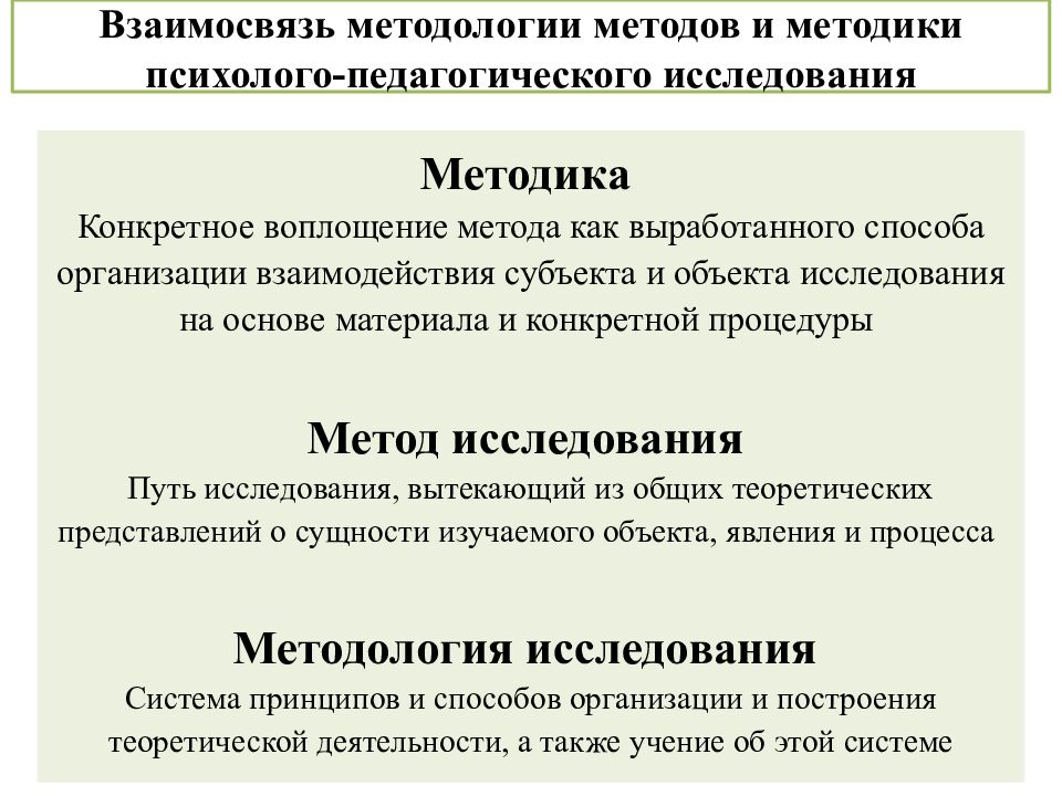 Методика Конкретное воплощение метода как выработанного способа организации взаимодействия субъекта и объекта исследования на основе материала и конкретной процедуры Метод исследования Путь исследования, вытекающий из общих теоретических представлений о сущности изучаемого объекта, явления и процесса Методология исследования Система принципов и способов организации и построения теоретической деятельности, а также учение об этой системе
