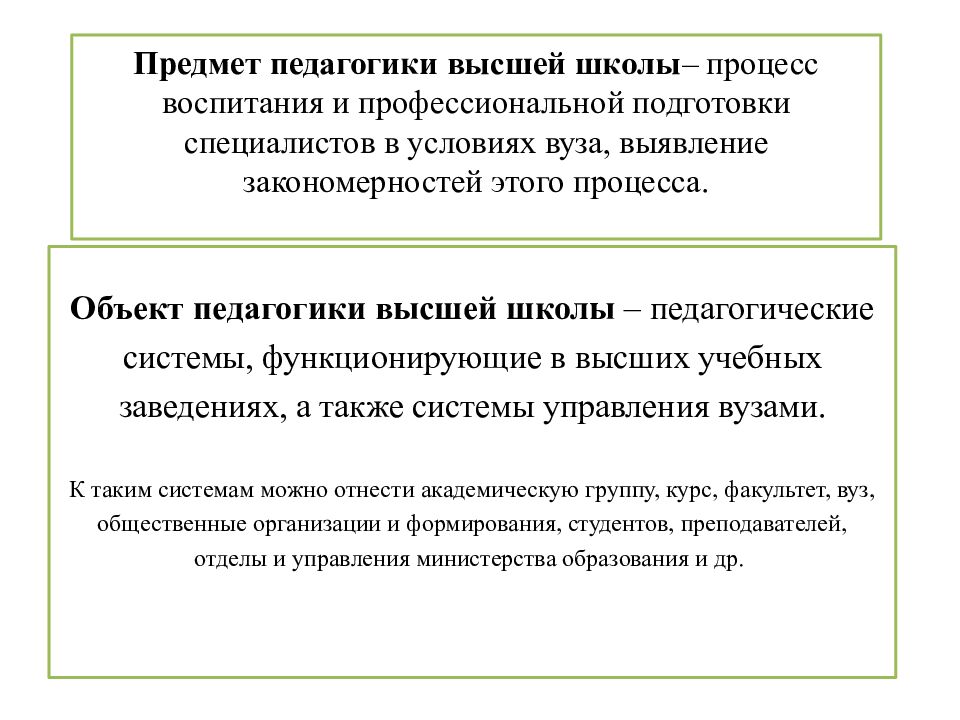 Объект педагогики высшей школы – педагогические системы, функционирующие в высших учебных заведениях, а также системы управления вузами. К таким системам можно отнести академическую группу, курс, факультет, вуз, общественные организации и формирования, студентов, преподавателей, отделы и управления министерства образования и др.