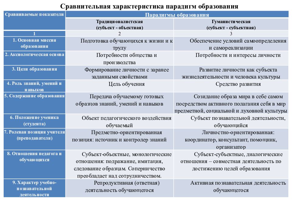 Сравниваемые показатели Парадигмы образования Традиционалистская (субъект - объектная) Гуманистическая (субъект - субъектная) 1 2 3 1. Основная миссия образования Подготовка обучающихся к жизни и к труду Обеспечение условий самоопределения и самореализации 2. Аксиологическая основа Потребности общества и производства Потребности и интересы личности 3. Цели образования Формирование личности с заранее заданными свойствами Развитие личности как субъекта жизнедеятельности и человека культуры 4. Роль знаний, умений и навыков Цель обучения Средство развития 5. Содержание образования Передача обучаемому готовых образцов знаний, умений и навыков Созидание образа мира в себе самом посредством активного полагания себя в мир предметной, социальной и духовной культуры 6. Положение ученика (студента) Объект педагогического воздействия обучаемый Субъект познавательной деятельности, обучающийся 7. Ролевая позиция учителя (преподавателя) Предметно-ориентированная позиция: источник и контролер знаний Личностно-ориентированная: координатор, консультант, помощник, организатор 8. Отношения педагога и обучающихся Субъект-объектные, монологические отношения: подражание, имитация, следование образцам. Соперничество преобладает над сотрудничеством. Субъект-субъектные, диалогические отношения – совместная деятельность по достижению целей образования 9. Характер учебно-познавательной деятельности Репродуктивная (ответная) деятельность обучающегося Активная познавательная деятельность обучающегося