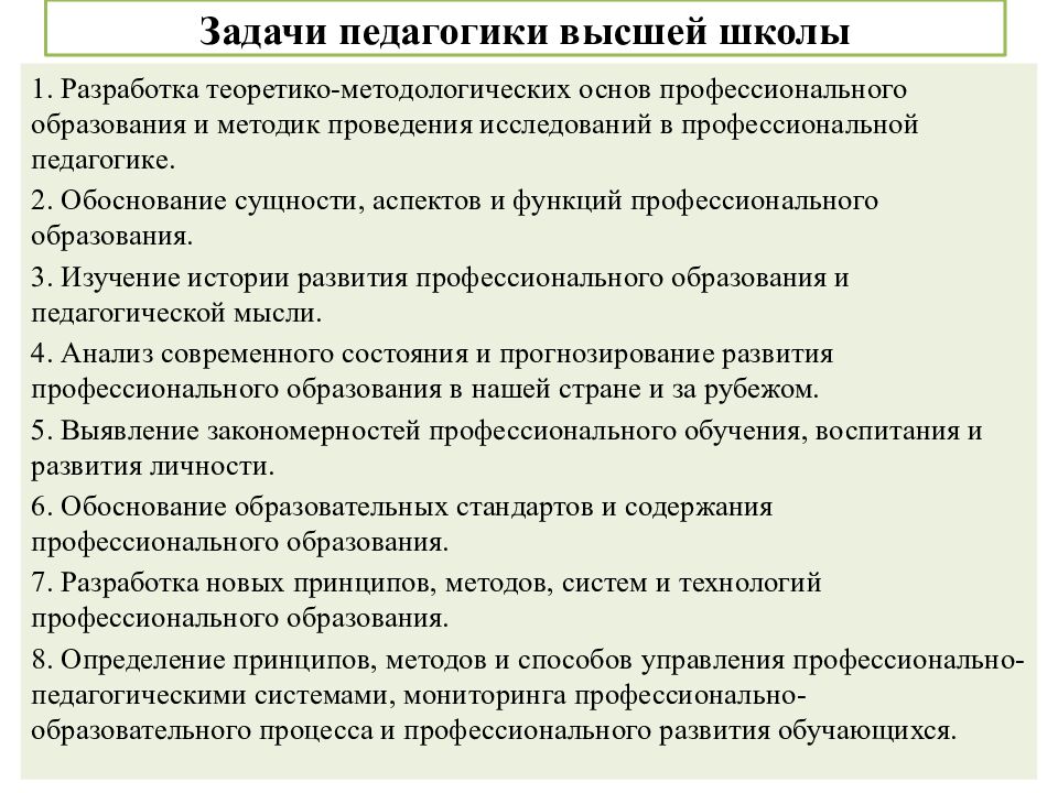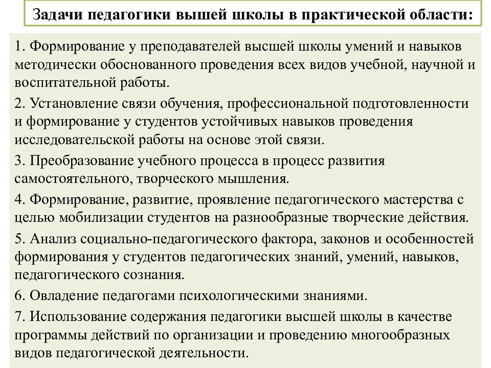 1. Формирование у преподавателей высшей школы умений и навыков методически обоснованного проведения всех видов учебной, научной и воспитательной работы. 2. Установление связи обучения, профессиональной подготовленности и формирование у студентов устойчивых навыков проведения исследовательской работы на основе этой связи. 3. Преобразование учебного процесса в процесс развития самостоятельного, творческого мышления. 4. Формирование, развитие, проявление педагогического мастерства с целью мобилизации студентов на разнообразные творческие действия. 5. Анализ социально-педагогического фактора, законов и особенностей формирования у студентов педагогических знаний, умений, навыков, педагогического сознания. 6. Овладение педагогами психологическими знаниями. 7. Использование содержания педагогики высшей школы в качестве программы действий по организации и проведению многообразных видов педагогической деятельности.